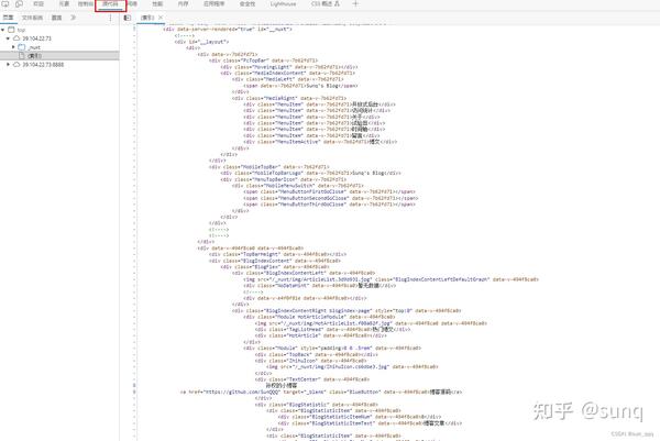 如下为使用Nuxt打包成静态页面前后,网站sources面板看到的html